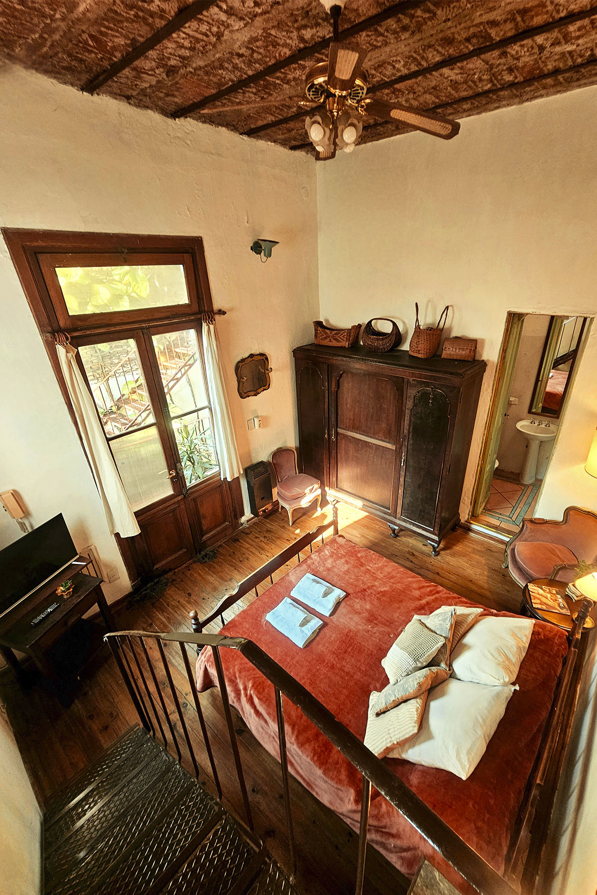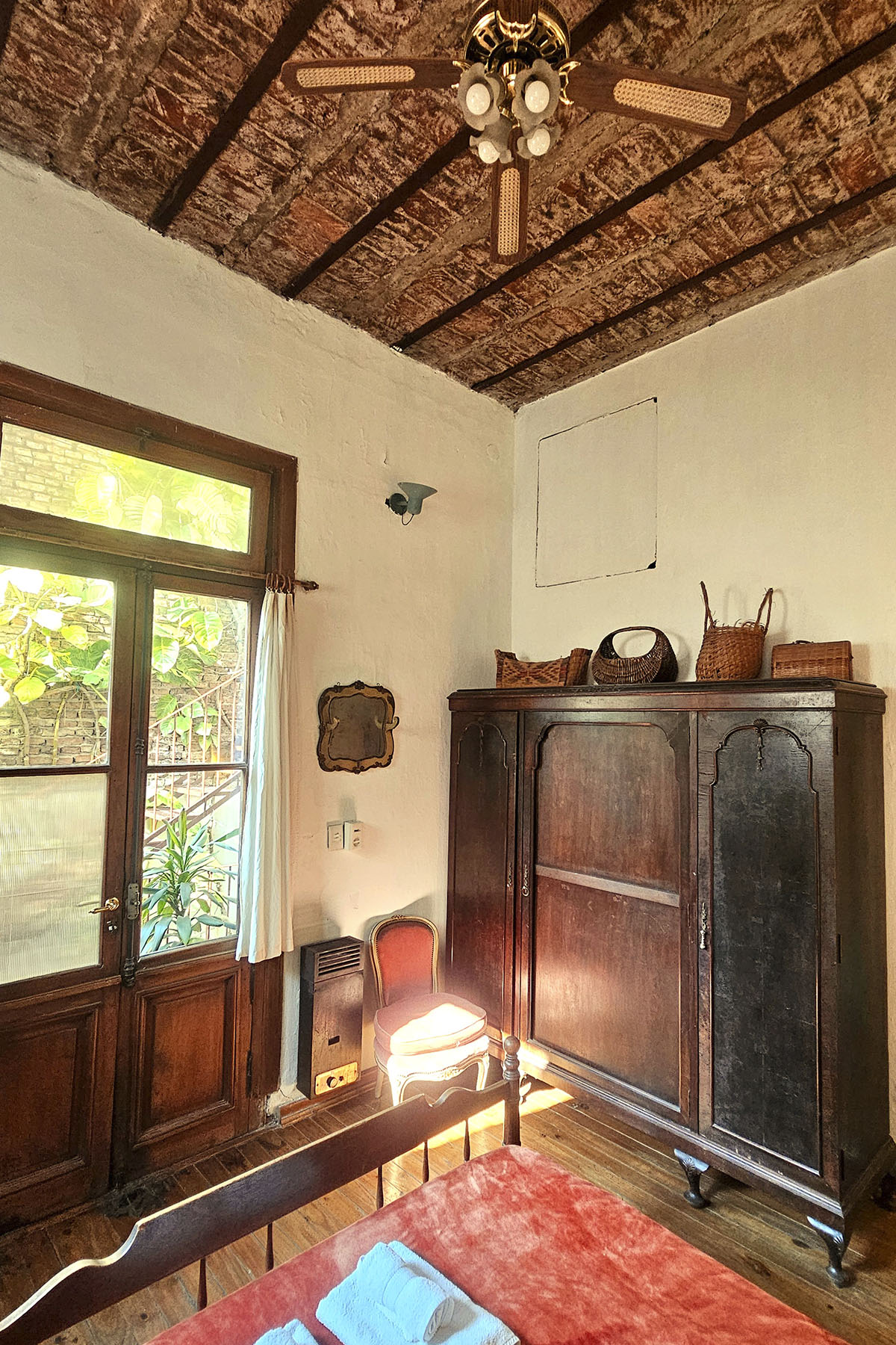 - Dormitorio con cama doble, piso de madera, ventilador antiguo y aire acondicionado frío/calor.