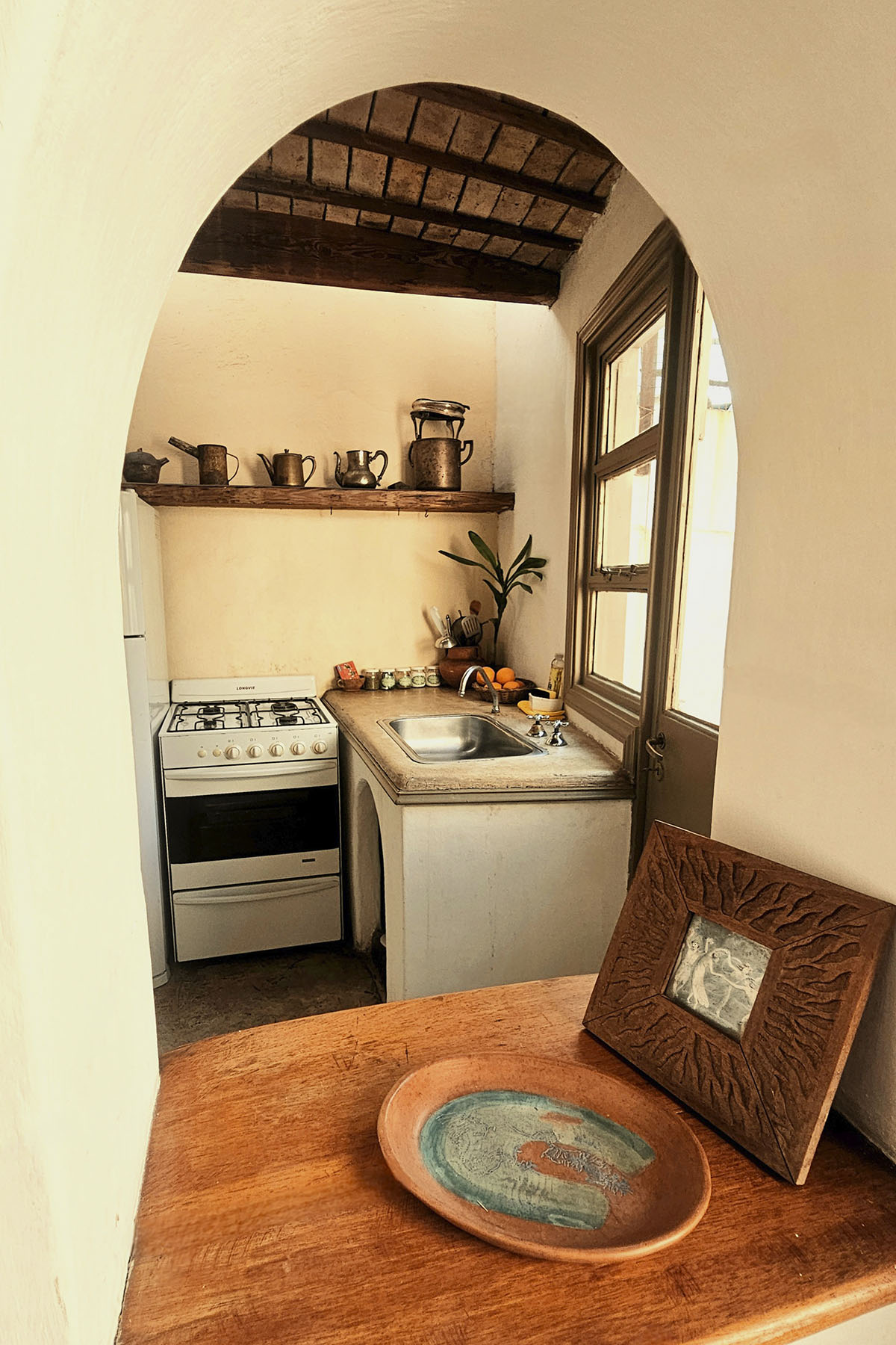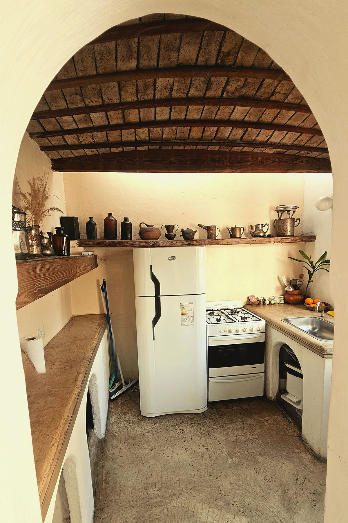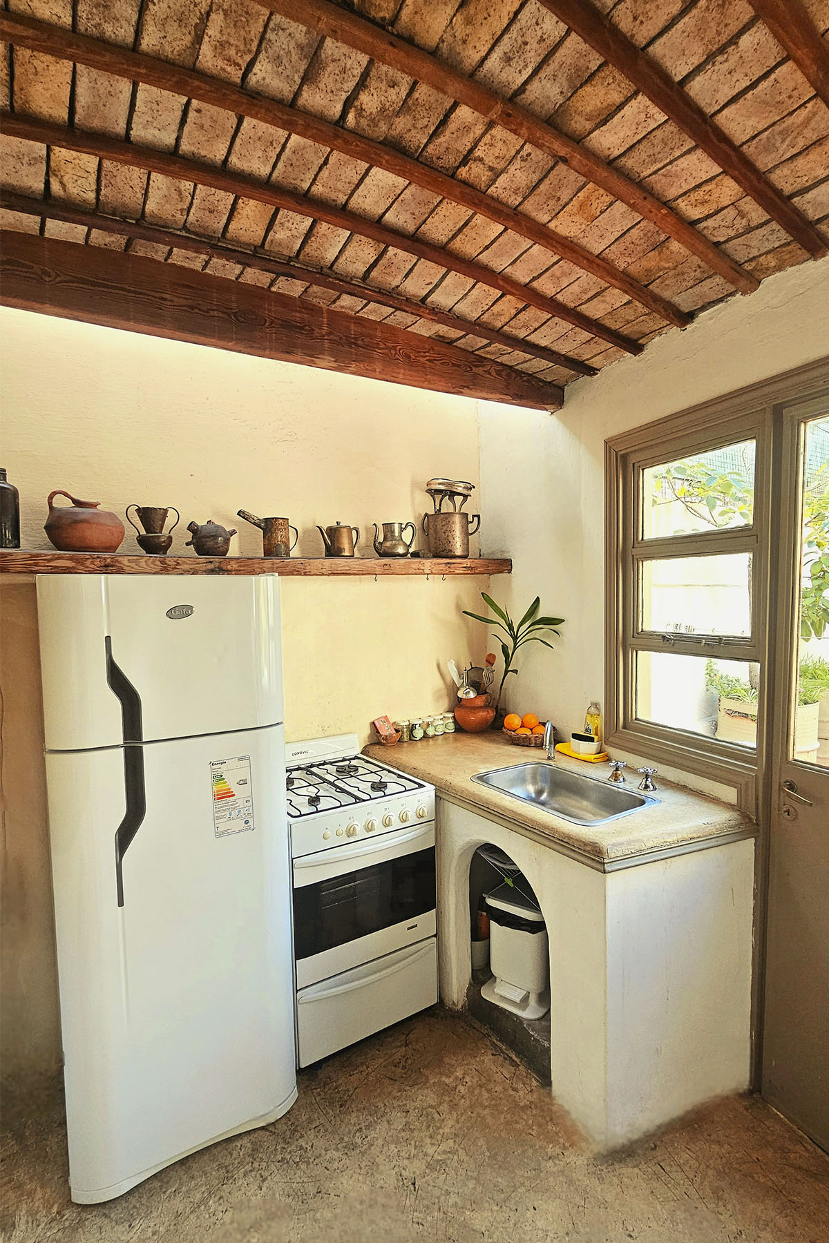 - Cocina equipada con heladera, cocina y horno a gas.