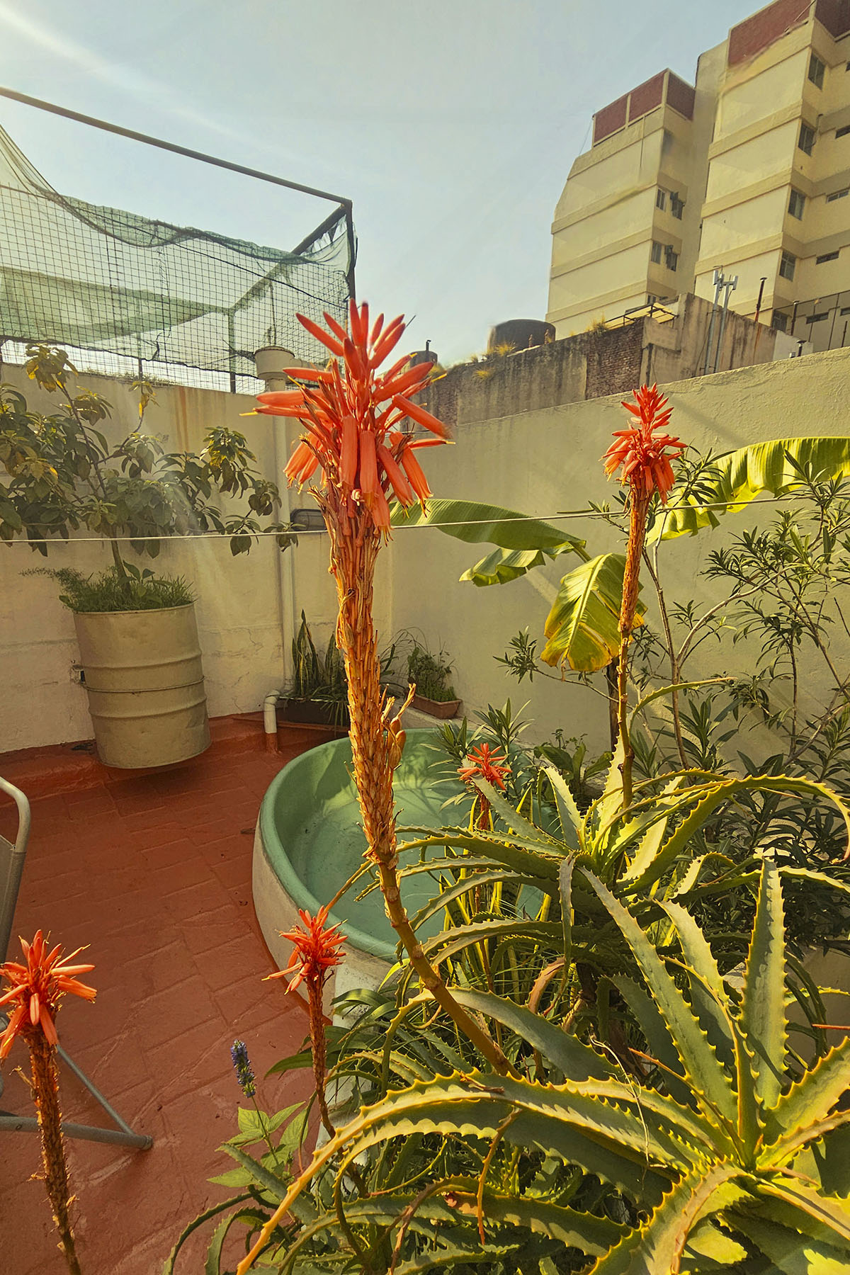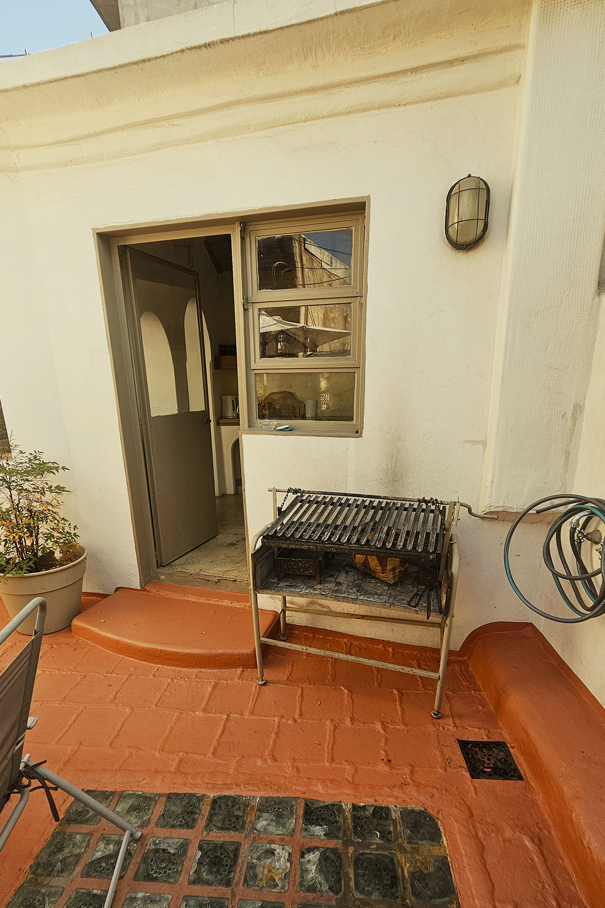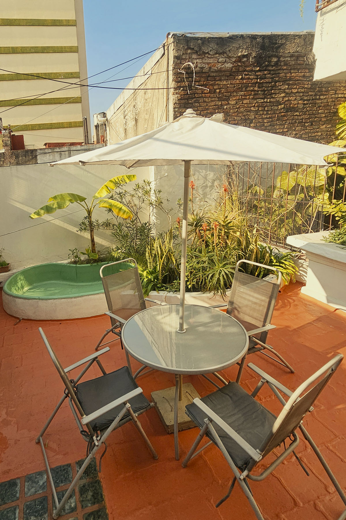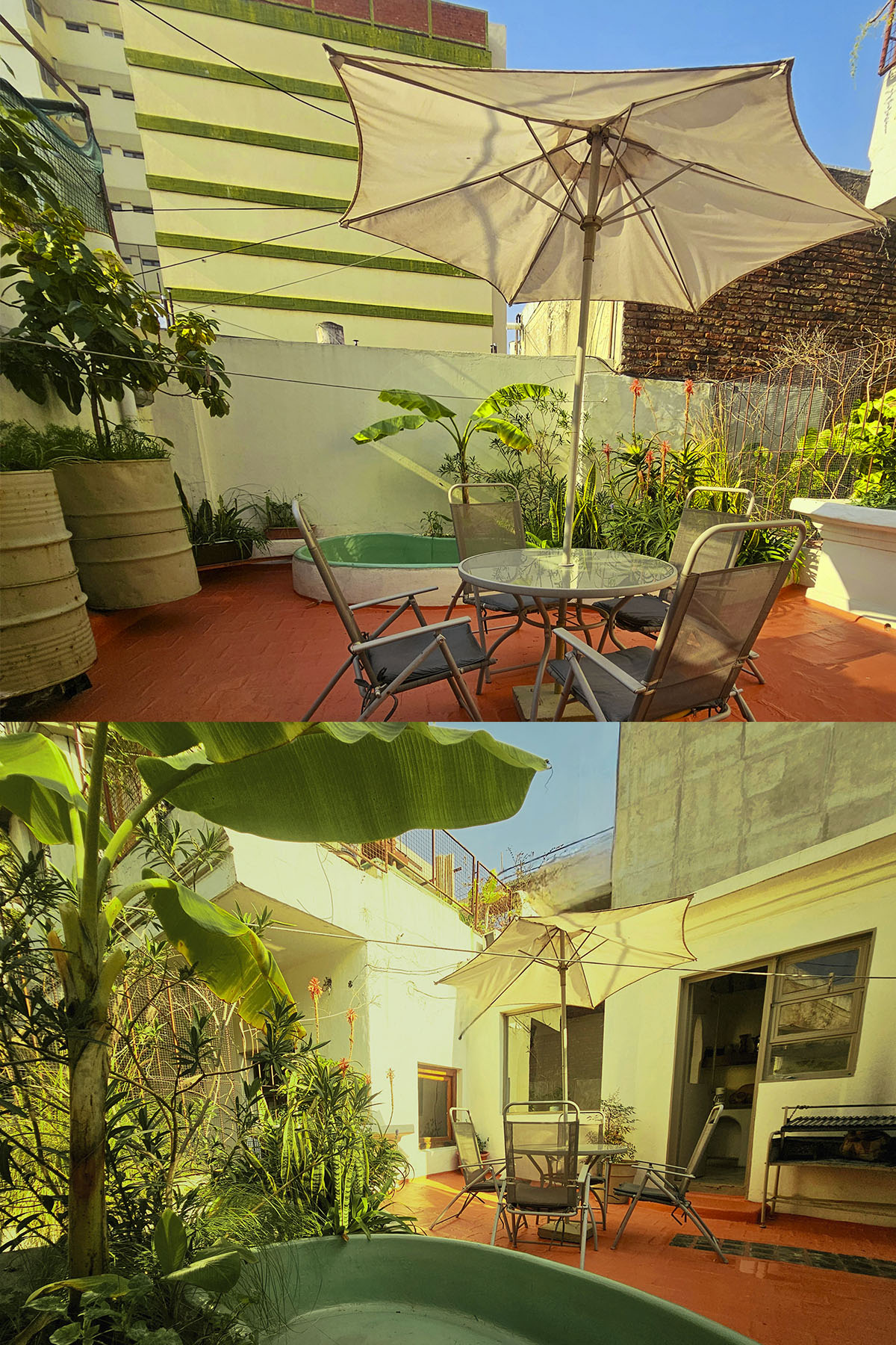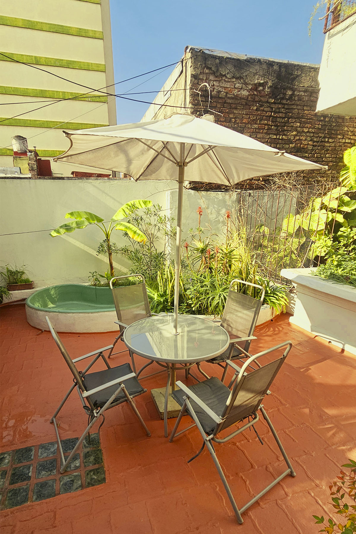 - Terraza privada de 25 m² con parrilla, mesa, sillas, sombrilla y pequeña pileta con agua fría/caliente.